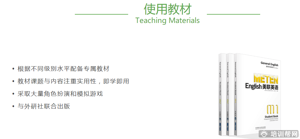 针对职场、日常生活与全球旅行、青少年英语成绩与英语实际运用能力提高,美联英语分别开发了实战商务英语、通用英语、全能青少英语三大教学产品,满足不同学习人群的需求。