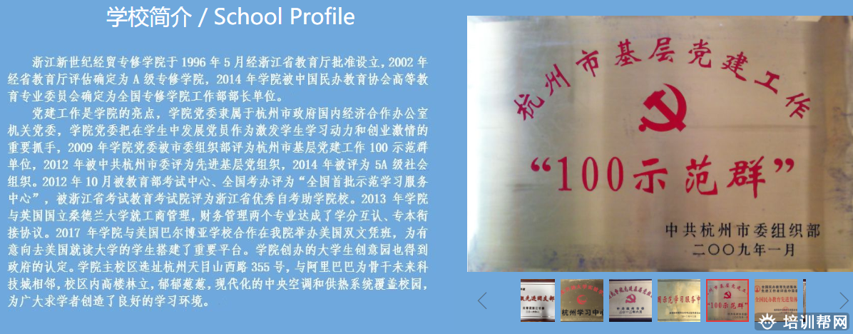 浙江新世纪经贸专修学院于1996年5月经浙江省教育厅批准设立,2002年经省教育厅评估确定为A级专修学院,2014年学院被中国民办教育协会高等教育专业委员会确定为全国专修学院工作部部长单位。
