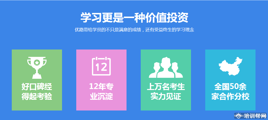 ?培训项目优路教育提供各种职业培训,包括建筑类:注册监理工程师、监理工程师岗位培训班、造价师、一级建造师、二级建造师、造价员、监理员、安全员、施工员、质检员、资料员、合同员;劳动部职业资格类:人力资源管理、秘书、物业管理师、物流师、心理咨询师、网络编辑员、理财规划师、广告设计师、电子商务师、项目管理师、营销师、企业文化师、企业信息管理师、企业培训师、职业指导人员等;财经类:会计证、会计职称、报关员、报检员、证券资格等;其他:导游证、教师双师证、外语、医疗类、青少年右脑开发等各类培训。