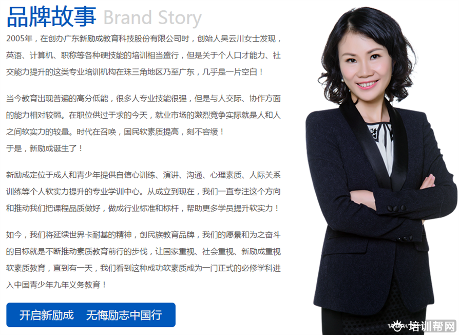 2005年,在创办广东新励成教育科技股份有限公司时,创始人吴云川女士发现,英语、计算机、职称等各种硬技能的培训相当盛行,但是关于个人口才能力、社交能力提升的这类专业培训机构在珠三角地区乃至广东,几乎是一片空白!