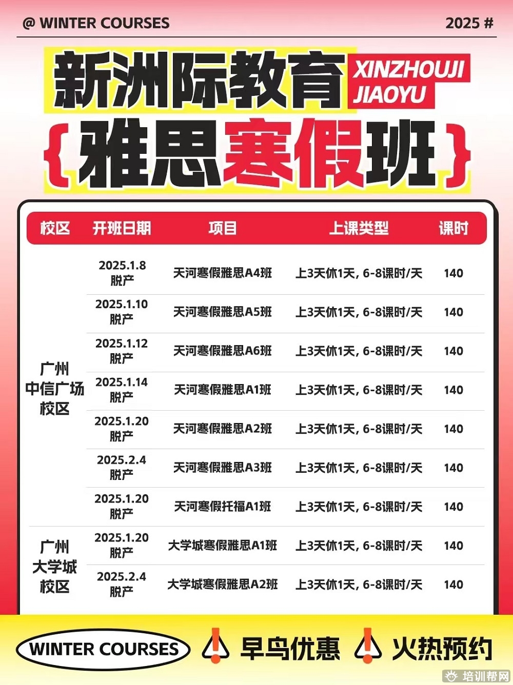新洲际雅思寒假班是珠海新洲际教育推出的专门针对雅思考试的培训课程,旨在帮助学生利用寒假时间提升雅思成绩。它具有多种优势,例如提供定制化学习方案,包括入学测试报告评估、定制学习方案、课程跟踪反馈以及定期调整学习方案等服务。其课程类型丰富,有封闭班、常规班等,还提供一对一和小班教学模式,能满足不同学员的需求。