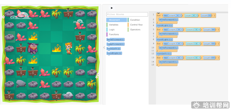 1)入门(趣味编程):通过可视化模块,理解基本逻辑结构,最终训练出独立写简单程序的能力;