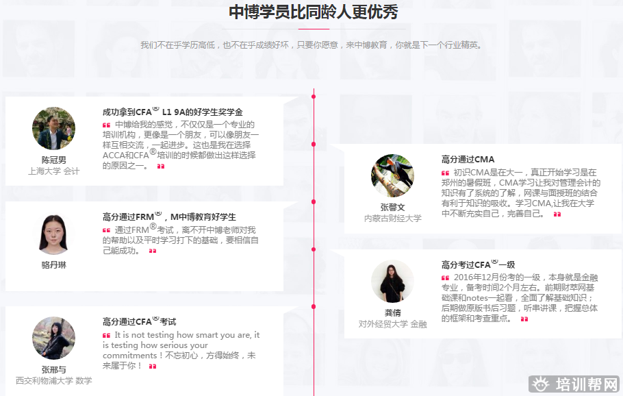 在ACCA、CMA、CFA®、FRM®、CIMA、CICPA等国际高端财经金融证书的教育上,中博教育以先进的知识管理体系、完善的客户服务系统、持续改善的学习型文化,赢得了学员的信赖,领跑于中国高端财经培训业。