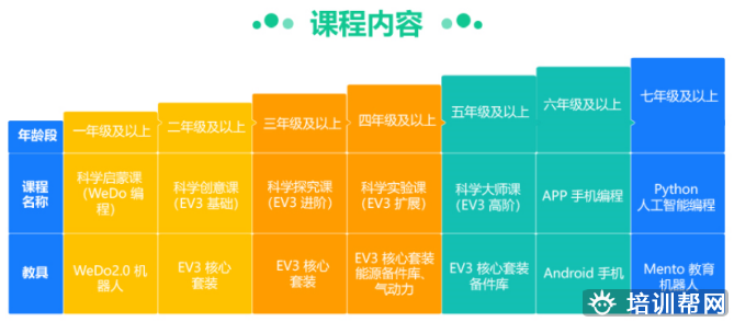 智能机器人课程含乐高WeDo和乐高EV3两门课程,乐高WeDo针对低年龄阶段研发的趣味机器人课程,EV3机器人编程课,基于乐高课程体系,面向国内国际各项大赛量身定制。