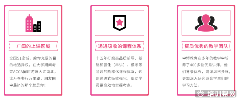 在ACCA、CMA、CFA®、FRM®、CIMA、CICPA等国际高端财经金融证书的教育上,中博教育以先进的知识管理体系、完善的客户服务系统、持续改善的学习型文化,赢得了学员的信赖,领跑于中国高端财经培训业。