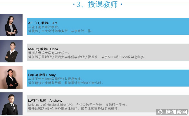 中博教育拥有400名独家精英讲师,皆为ACCA会员、CMA会员、CIMA会员、CFA®会员、FRM会员且多人同时持有CICPA执照、AICPA执照、HKICPA执照、英国律师执照、纽约州律师执照、中国律师执照、澳洲注册会计师执照等。半数以上讲师硕士毕业于美国常春藤高校、英国G5高校或中国C9高校。大多数讲师拥有11年以上企业管理经验。中博教育总部设立于北京,至2017年7月已拥有51所统一师资、统一管理的直属分公司203个教学点,包括北京、上海、广州、深圳、天津、郑州、开封、济南、青岛、烟台、威海、杭州、宁波、苏州、南京、无锡、徐州、镇江、贵阳、成都、重庆、哈尔滨、长春、沈阳、大连、合肥、蚌埠、芜湖、武汉、长沙、石家庄、秦皇岛、保定、唐山、洛阳、太原、西安、昆明、南宁、桂林、百色、柳州、呼和浩特、海口、珠海、福州、厦门、兰州、南昌等地。现有非教学员工1000余人。