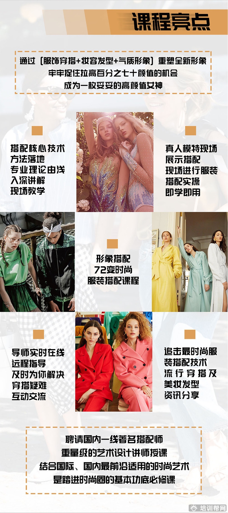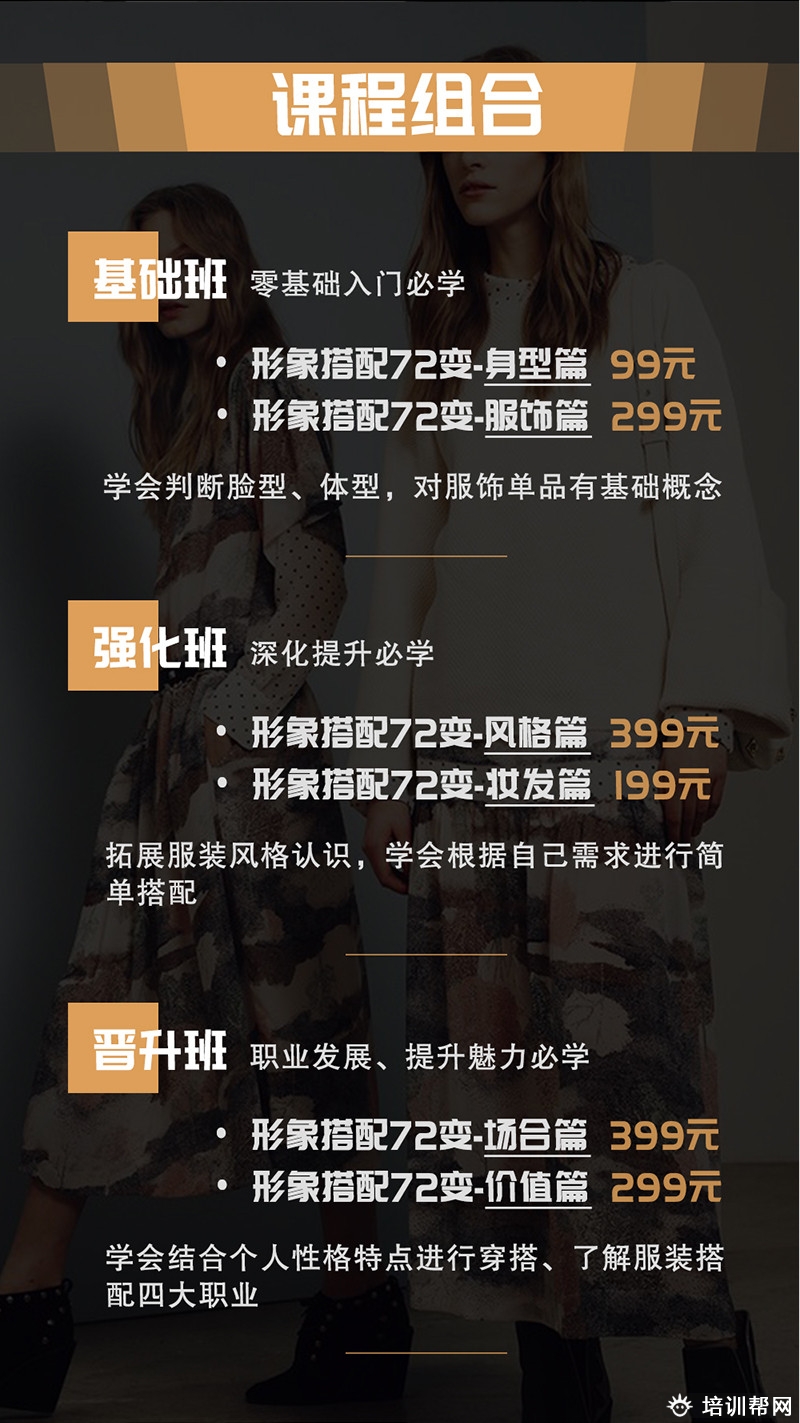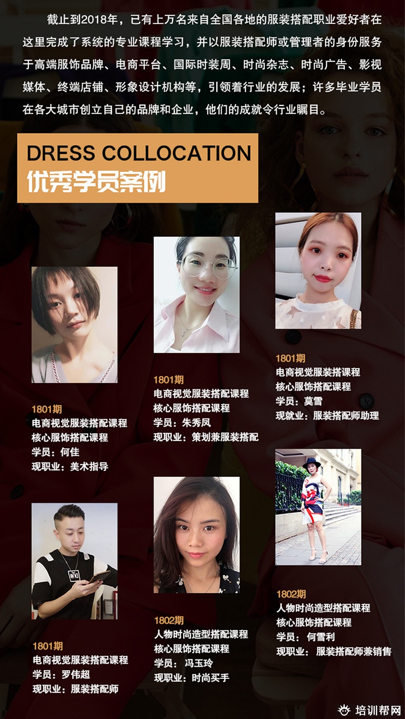核心服饰搭配班、电商视觉服装搭配班、人物时尚造型搭配班、实体服饰陈列搭配班、终端创新零售搭配班