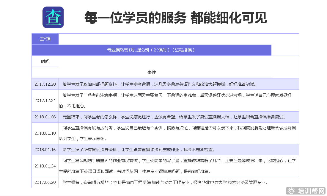 3、校区顾问会不定期回访学员,了解基础情况,请学员配合顾问回访。