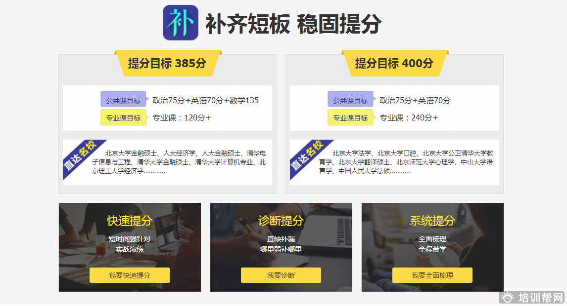 | 专业课私密1对1 提分班 详情咨询 | 1)可以去目标院校,可面授 2)无法去目标院校,远程上课 | 1)专业课师资全程辅导 2)目标院校专业内部资料提供 3)班主任全程督学导学 4)学习进度分析 5)免费答疑 6)考研资讯定期发放 7)图书资料免费邮寄 8)考研心理辅导 | 20课时起 | 6000元起 | |