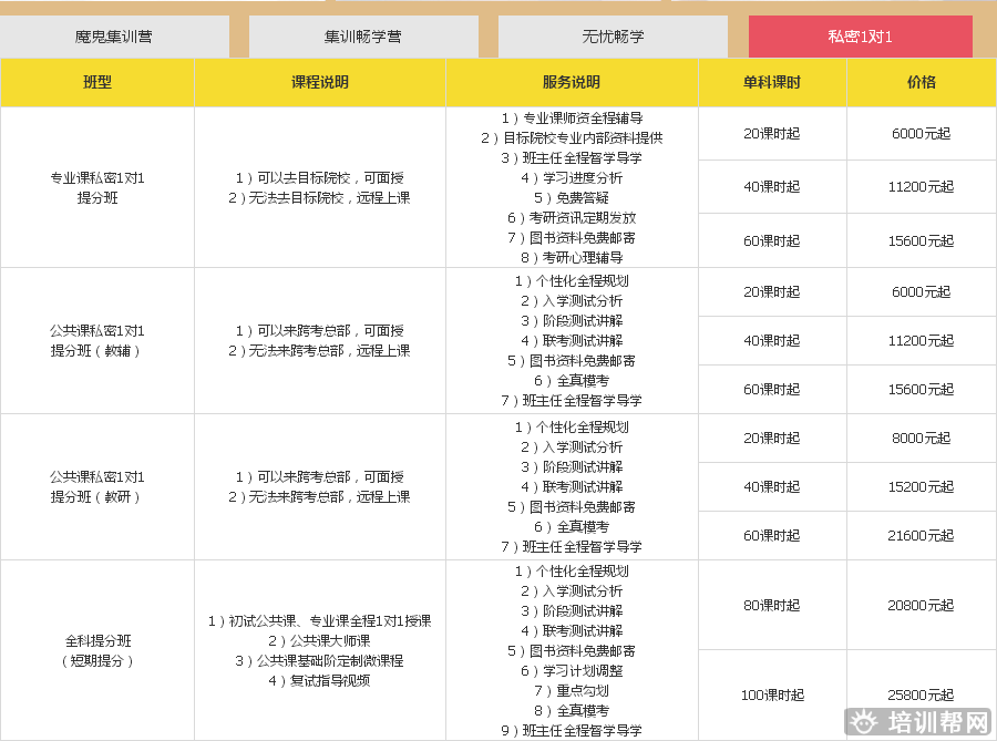 白班、晚班、业余制班、周末班、一对一定制课程(详情请咨询顾问)