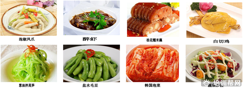 2、韩国泡菜 炝腰花 挂霜腰果 白切鸡 萝卜干毛豆子 白切肉 凉拌海蜇 卤水门腔 糟肚头