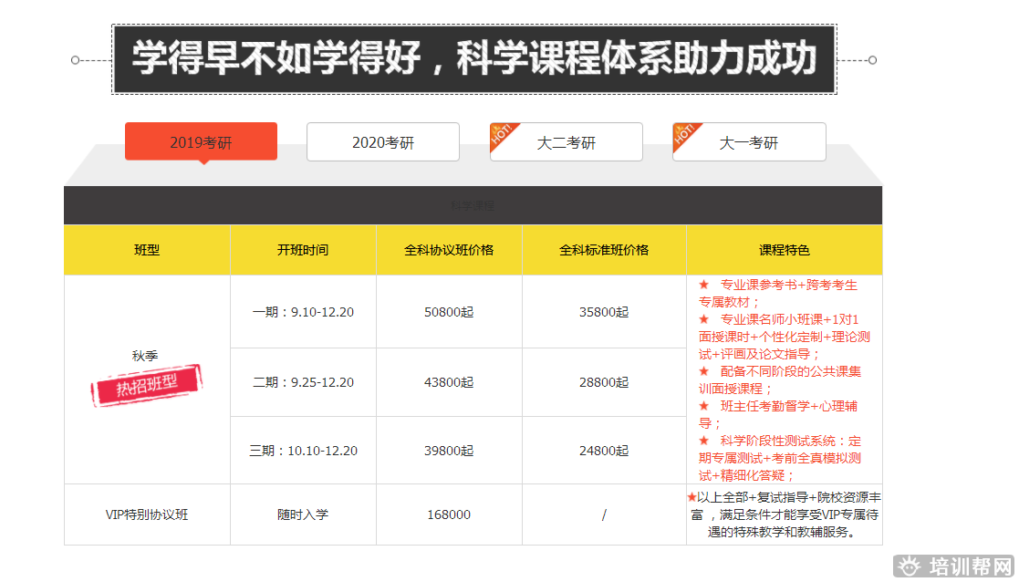 课程安排时间: 白班、晚班、业余制班、周末班、一对一定制课程(详情请咨询顾问) 白 班:8:30-16:30 (周一至周五白天时间段选择) 全日制:8:30-11:30/13:40-16:30 (周一至周五全天上课) 晚上班:18:00-21:00 周 末:8:30-16:30(每周六或周日全天) 具体上课时间学员根据自身时间安排选择报班。 课程周期: 课程周期长短以学员实际所报班级为准,一对一课程和培训老师沟通安排。 课程收费: 因学员自身基础和所要学习达到的程度、报班时间长短等客观因素不等,我们开设有不同的班级,费用有所区别,费用以学员所报班级为准,学员根据自身要求选择报班,如有疑问请咨询报名老师。 不同时间校区有不同的优惠活动,详细优惠以当时参加的优惠活动为准。 预约试听体验课程: 学员如需参加体验课程,至少需提前一周和顾问预约体验课程,提供给顾问参加学员姓名+电话+课程+所在地区,顾问会及时登记预约就近校区体验课程,预约成功后顾问会通过电话或短信及时通知学员。 报名须知: 1、外地学员,需代办食宿,提前和老师预约沟通。 2、学费不包含食宿费用。(全日制住宿课程除外) 3、校区顾问会不定期回访学员,了解基础情况,请学员配合顾问回访。 4、课程调换或改期,需到校区和课程老师沟通。 5、课程退班退费,学员需到校区办理。(实际情况以校区规定为准) 6、报名完成后保留好报名票据,以及课程老师联系电话,以便后期和老师跟进。 7、优惠活动请和报名老师咨询了解。 我们竭诚为您服务,如需帮助或了解最新优惠活动,请在线联系顾问,顾问会第一时间安排课程老师电话和您沟通介绍! |