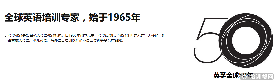 EF英孚教育是全球知名私人英语教育机构,主要致力于语言学习、留学旅游及学位课程等方面。EF 英孚教育已经把世界变成了一个英语大课堂。创新的英语学习系统、完全整合定制的英语教学材料、经过国际资格认证的优秀外籍培训师、地处市区交通便利的现代化英语学习环境以及出游国外学习英语的机会。